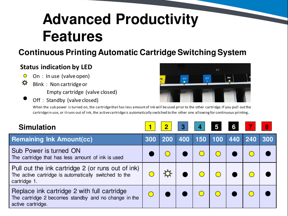 The Roland RF Series is a single-compound-head system designed for high-speed economical banner printing and is similar to the VSi series, but without the contour cutter and without the metallic/white ink settings. The RF-640 has new features including enhanced network messaging and a new ink-switching system which allows for ink cartridge replacement during continuous machine operation by running each of the dual-CMYK ink cartridges in series.